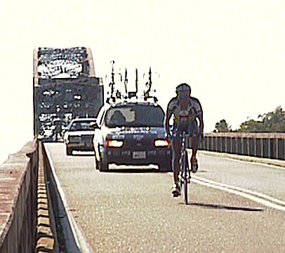 テネシー川を渡る桜井選手。自転車は既に深刻なトラブルに見舞われている。 この後、自転車を交換するために装備の移動に惜しい時間を費やさざるを得なくなった。(上・DC-1)