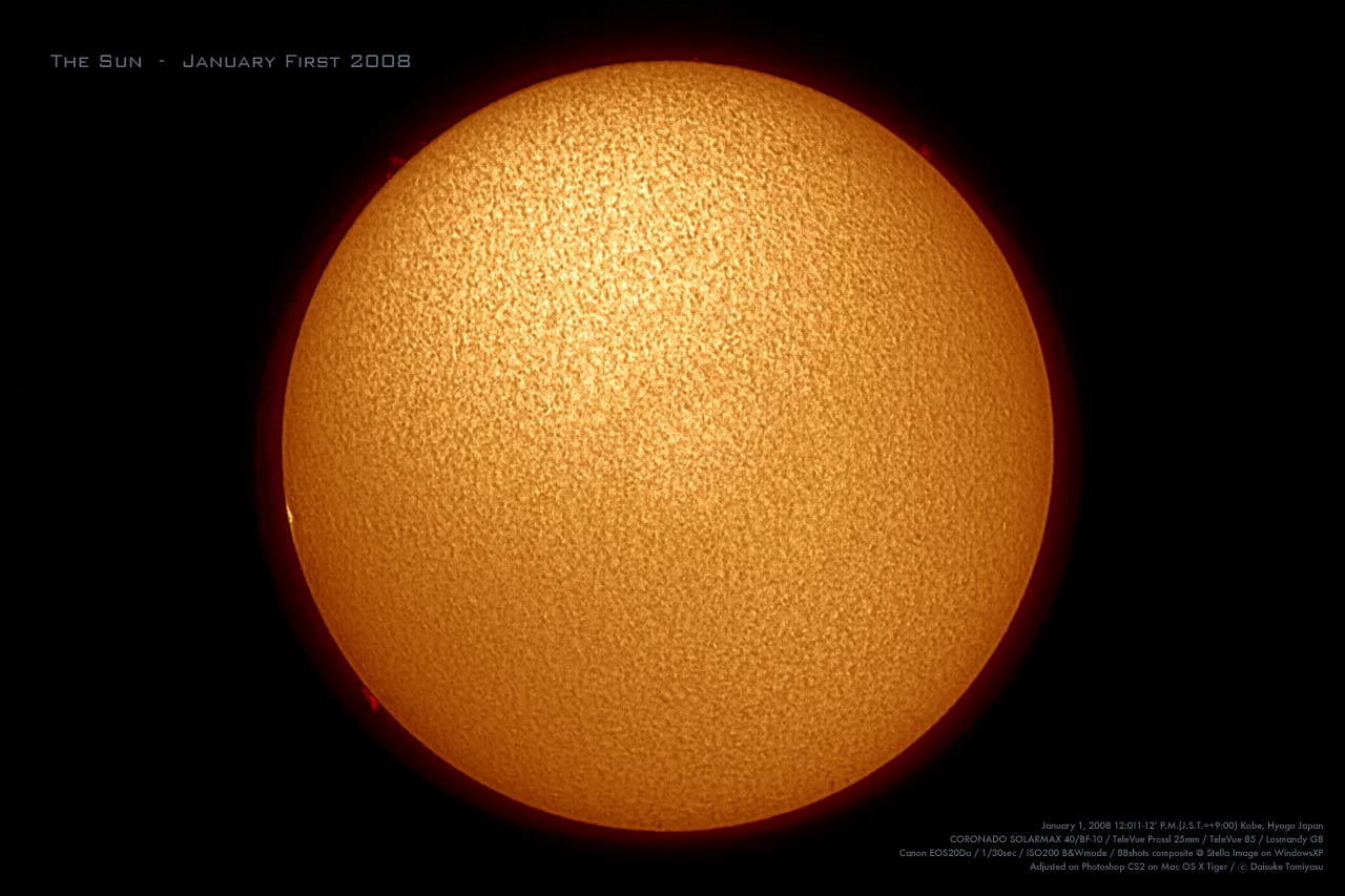 The sun at the first day of the year again. I felt it is not so good because no sun spot. However, spaceweather.com tells "Dec. 31st around 0110 UTC, something exploded just behind the sun's eastern limb". It is visible at picture left as white dot on the limb.