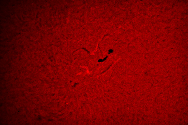 Anyway, today, last morning I settled TV85 with Coronado filter again on the Losmandy G8 mount at my home out of the window. Set up the camera, eye drop to the eyes and then waited about 5 minutes - kept my eye on the finder without winking because one wink is enough long to miss the shot. Finally I made this shot - about 5 minutes earlier than morning of yesterday.
