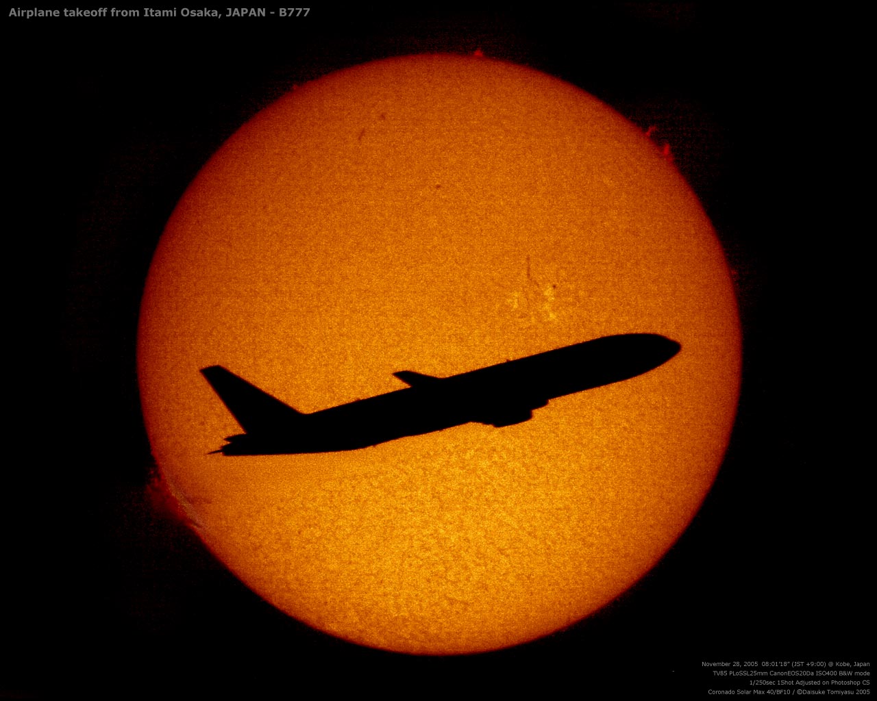 * Picture taken as B&W because H-alpha is only red. Use photoshop to made color as H alpha picture. But airplane shadow is not made on photoshop!!