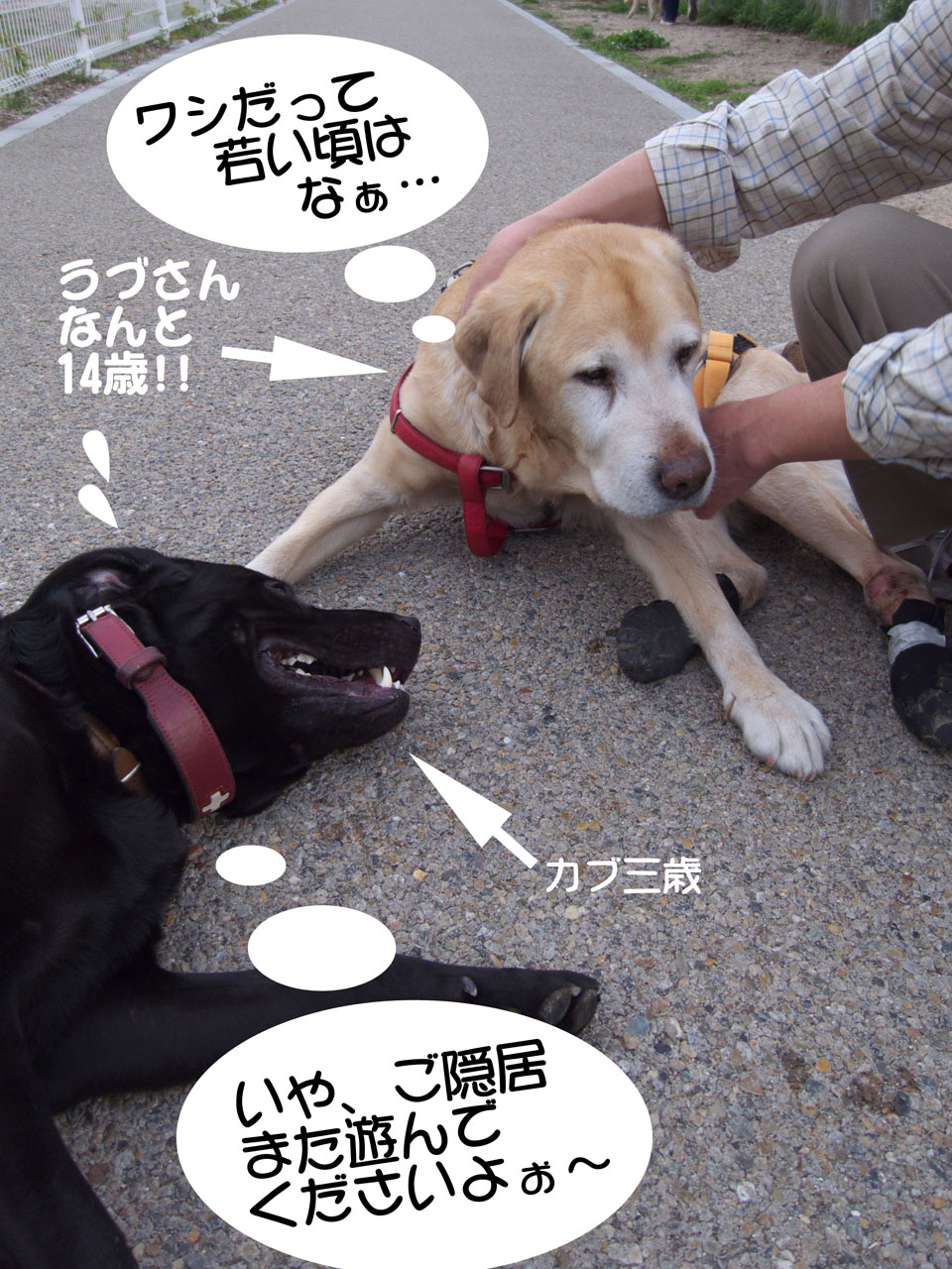 まぁ、しかしそんな物騒な話は置いておくとして、本当に今時の老犬たちには幸せそうな犬が多い。今日会ったラブ君も、既に14歳と聞いて驚いた。もう一頭、良く会う15歳のラブラドールも、それなりに元気。小型犬の15歳は人間の76歳だが、大型犬の14歳は人間の103歳に相当するというから、驚かずにはいられない。何だかんだ言って、つまるところ、ご家族の愛情が支えているのだろう。