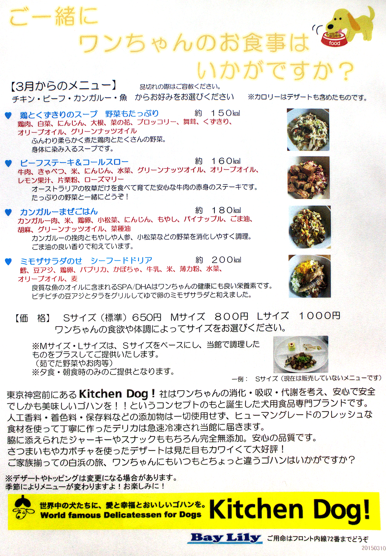 頃合いを見計らって、ベイリリィへ移動。かつて知った場所、分かった道で、迷わず到着。三浦支配人はお休みだったけれど、大旦那さんがたに、にこやかに歓迎された。カブ君も覚えているらしく、大喜びだ。ドッグラン脇の犬舎の主、看板犬のトイ君も元気そう。何やら豪華なワンコ用夕食メニュー(写真右)ができていて、選んでくださいとのこと。魚かなぁ…いや、珍しいからこっちでしょう、という妻の勧めで、カンガルーに。